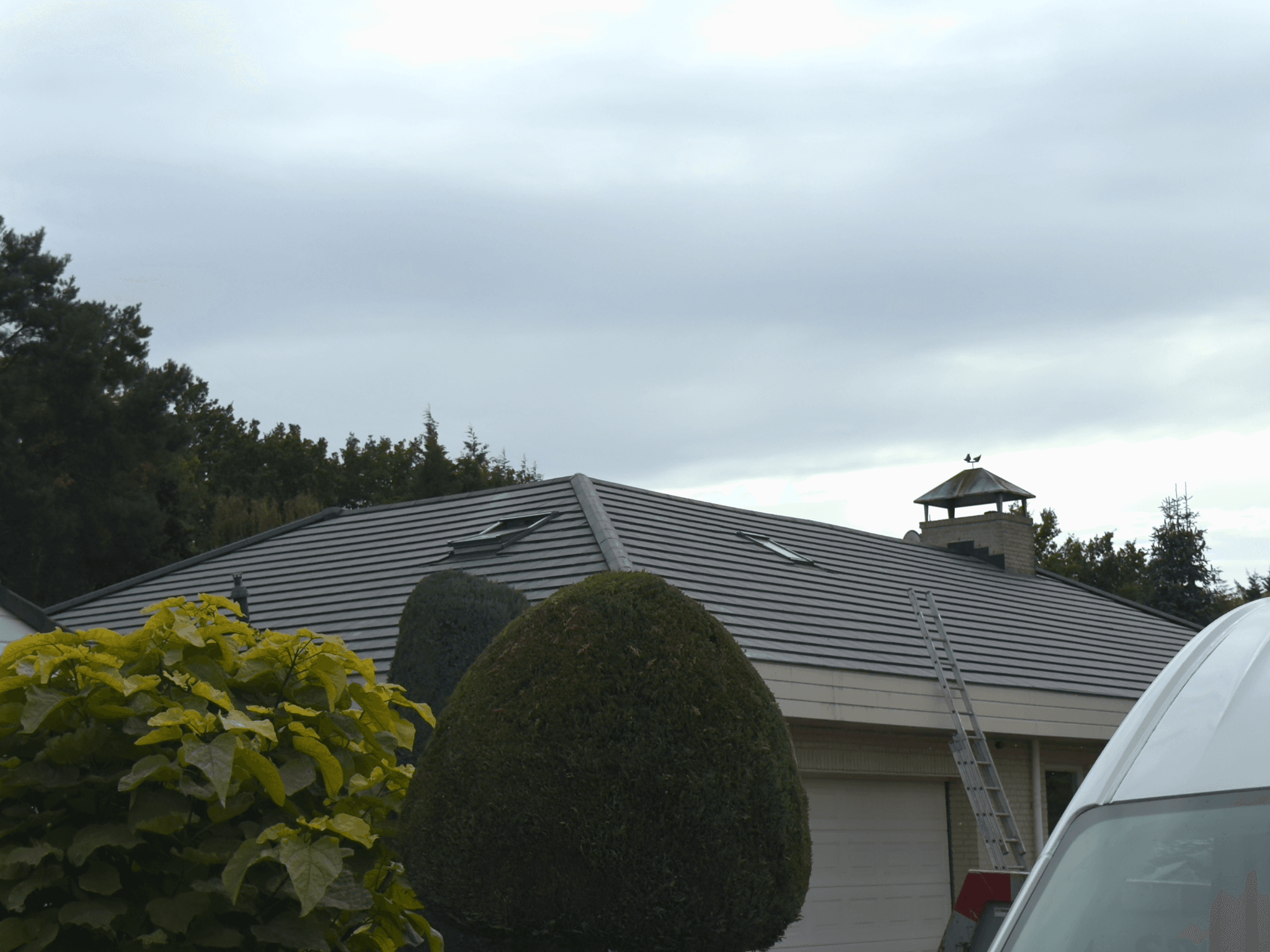 Daarna komt de afwerking. De nieuwe dakpannen geven het huis weer een frisse, moderne uitstraling. De donkere kleur sluit mooi aan bij de lichte gevel, en zorgt voor een stijlvol contrast dat perfect past bij de omgeving.