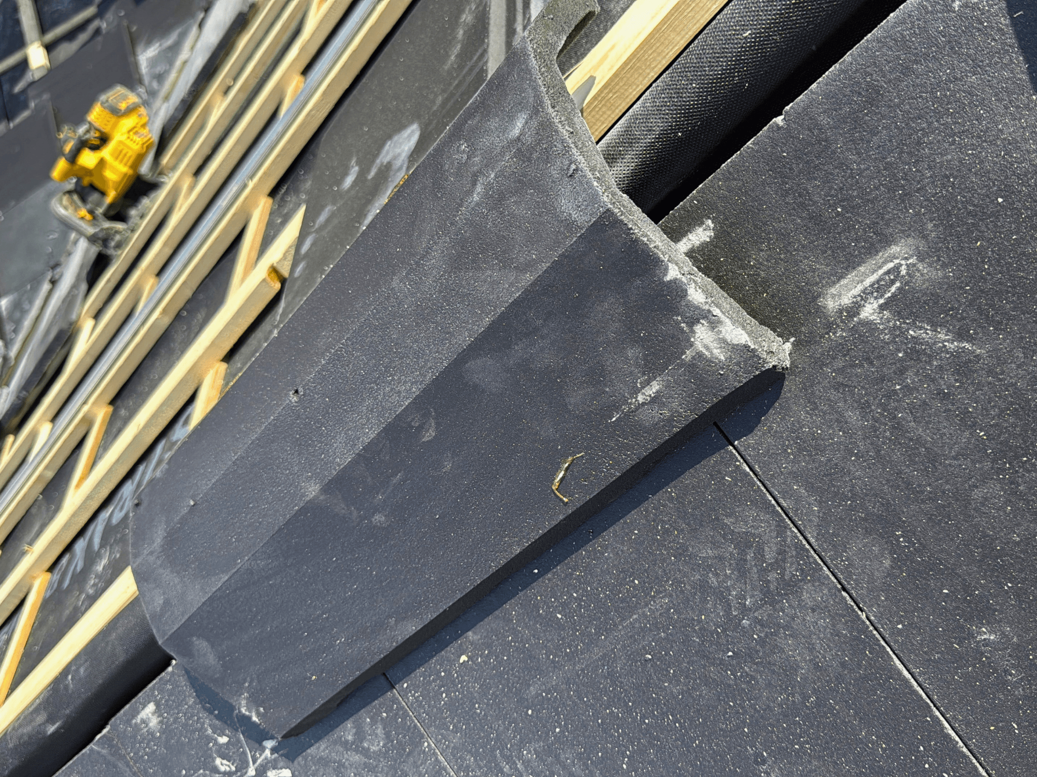 Bij dit dak in Eindhoven hebben we bovendien de nokken vernieuwd — dat zie je goed op de foto hieronder. Dat is niet alleen mooier, maar ook functioneel: de nokken zorgen dat de dakvlakken naadloos op elkaar aansluiten en water netjes wordt afgevoerd.